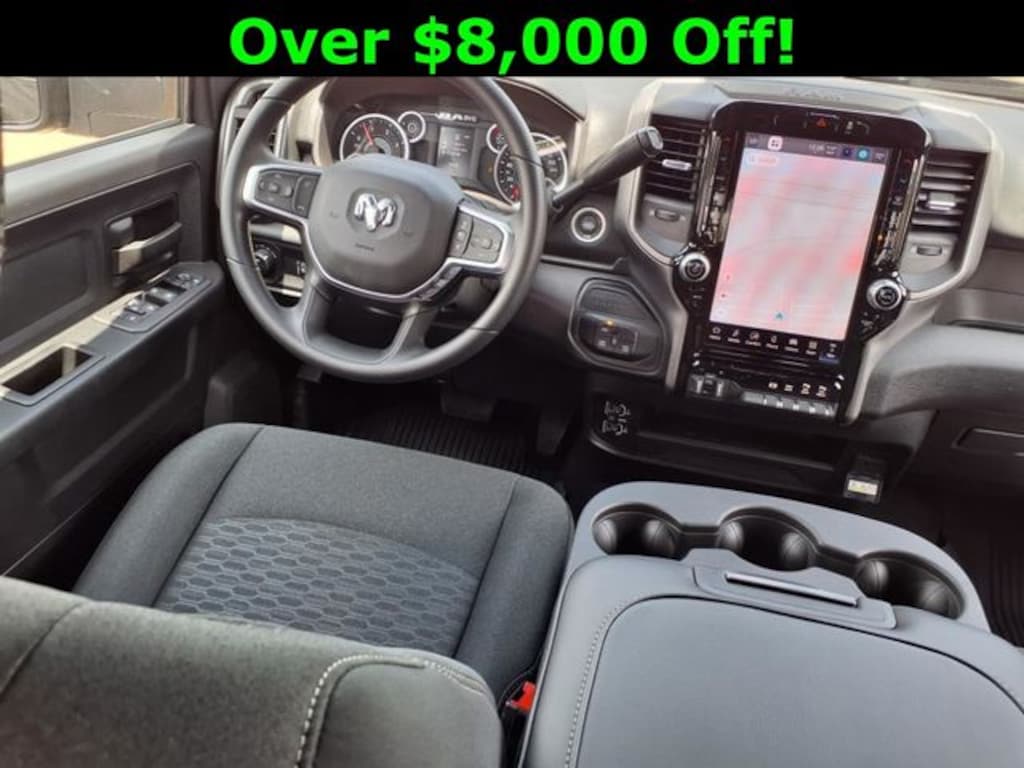 Bed Convenience Group (LED Bed Lighting and MOPAR Spray In Bedliner), Quick Order Package 24A Tradesman, Tradesman Level 2 Equipment Group (115V Auxiliary Front Power Outlet, 12" Touchscreen Display, 2 Way Rear Headrest Seat, 4 Way Front Headrests, 40/20/40 Split Bench Seat, 400W Inverter, 4G LTE Wi-Fi Hot Spot, Air Conditioning ATC w/Dual Zone Control, Alexa Built-In, Anti-Spin Differential Rear Axle, Apple CarPlay, Auto-Dimming Rear-View Mirror, Black Exterior Mirrors, Bright Front Bumper, Bright Rear Bumper, Carpet Floor Covering, Center Hub, Chrome Grille Surround, Cloth 40/20/40 Bench Seat, Connected Travel & Traffic Services, Connectivity - US/Canada, Disassociated Touchscreen Display, Emergency Vehicle Alert System (EVAS), Exterior 115V AC Outlet, Exterior Mirrors Courtesy Lamps, Exterior Mirrors w/Heating Element, Exterior Mirrors w/Supplemental Signals, Front & Rear Floor Mats, Front Armrest w/Cupholders, Global Telematics Box Module (TBM), Google Android Auto, GPS Antenna Input, GPS Navigation, HD Radio, Integrated Voice Command w/Bluetooth, Manual Adjust 4-Way Driver Seat, Manual Adjust 4-Way Front Passenger Seat, Manual Folding Exterior Mirrors, Manual Telescoping Mirrors, Matte Black Mesh Grille w/Chrome, Mirror Running Lights, Mopar Black Tubular Side Steps, Off-Road Info Pages, ParkSense Front/Rear Park Assist System, Power Adjust Mirrors, Power Adjustable Convex Aux Mirrors, Power Heated Folding Telescope Mirrors, Radio: Uconnect 5 Nav w/12.0" Display, Rear Folding Seat, Rear Power Sliding Window, Remote USB Port - Charge Only, Selectable Tire Fill Alert, SiriusXM Radio Service, SiriusXM w/360L, Storage Tray, Tinted Acoustic Windshield Glass, Trailer Tow Pages, and Wheels: 18" x 8.0" Steel Chrome Clad), 4-Wheel Disc Brakes, 5th Wheel/Gooseneck Towing Prep Group, 6 Speakers, ABS brakes, Air Conditioning, AM/FM radio: SiriusXM, Apple CarPlay/Android Auto, Black Wheel Center Hub, Brake assist, Clearance Lamps, Compass, Delay-off headlights, Driver door bin, Dual front impact airbags, Dual front side impact airbags, Electronic Stability Control, Front anti-roll bar, Front Center Armrest w/Storage, Front fog lights, Front License Plate Bracket, Front reading lights, Fully automatic headlights, Heavy Duty Vinyl 40/20/40 Split Bench Seat, Illuminated entry, Low tire pressure warning, MOPAR Front & Rear Rubber Floor Mats, Occupant sensing airbag, Outside temperature display, Overhead airbag, Overhead console, Panic alarm, ParkView Rear Back-Up Camera, Passenger door bin, Passenger vanity mirror, Power steering, Power windows, Radio data system, Radio: Uconnect 5 w/8.4" Display, Rear anti-roll bar, Rear step bumper, Rear window defroster, Remote keyless entry, Speed control, Tachometer, Tilt steering wheel, Traction control, Variably intermittent wipers, Voltmeter, and Wheels: 17" x 7.5" Black Steel Styled.