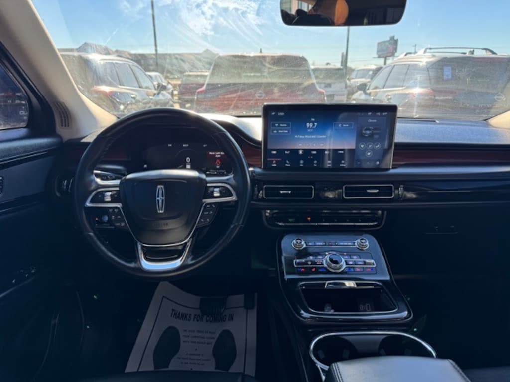 This vehicle includes the following features and options: Cargo Utility Package (110V/150W AC Power Outlet, Cargo Compartment w/Reversible Mat, Interior Cargo Cover, Molded Plastic Storage Bins, and Rear Cargo Management System), Class II Trailer Tow Package, Equipment Group 200A, Lincoln Co-Pilot360 1.0 Plus Package (360 Degree Camera w/Rear Camera Wash, Active Park Assist 2.0, Adaptive Cruise Control, Distance Indication & Alert, Evasive Steering Assist, and Forward-Side-Rear Parking Sensors), 10 Speakers, 3.80 Axle Ratio, 4-Wheel Disc Brakes, ABS brakes, Air Conditioning, Alexa Built-In, Alloy wheels, AM/FM radio: SiriusXM with 360L, Auto High-beam Headlights, Auto tilt-away steering wheel, Auto-dimming door mirrors, Auto-dimming Rear-View mirror, Automatic temperature control, Brake assist, Bumpers: body-color, Compass, Delay-off headlights, Driver door bin, Driver vanity mirror, Dual front impact airbags, Dual front side impact airbags, Electronic Stability Control, Emergency communication system: 911 Assist, Four wheel independent suspension, Front anti-roll bar, Front Bucket Seats, Front Center Armrest w/Storage, Front dual zone A/C, Front reading lights, Fully automatic headlights, Garage door transmitter: HomeLink, Heated door mirrors, Heated front seats, Heated rear seats, Heated steering wheel, Illuminated entry, Knee airbag, Leather steering wheel, Low tire pressure warning, Memory seat, Navigation System, Occupant sensing airbag, Outside temperature display, Overhead airbag, Overhead console, Panic alarm, Passenger door bin, Passenger vanity mirror, Power door mirrors, Power driver seat, Power Liftgate, Power moonroof: Panoramic Vista Roof, Power passenger seat, Power steering, Power windows, Prem Lthr-Trimmed Heated/Ventilated Captain Seats, Radio data system, Radio: AM/FM/HD Audio System, Rain sensing wipers, Rear anti-roll bar, Rear reading lights, Rear seat center armrest, Rear window defroster, Rear window wiper, Remote keyless entry, Satin Roof Rack Side Rails w/o Crossbars, Security system, Speed control, Speed-sensing steering, Speed-Sensitive Wipers, Split folding rear seat, Spoiler, Steering wheel memory, Steering wheel mounted A/C controls, Steering wheel mounted audio controls, SYNC 4 w/Enhanced Voice Recognition, Tachometer, Telescoping steering wheel, Tilt steering wheel, Traction control, Trip computer, Turn signal indicator mirrors, Variably intermittent wipers, Ventilated front seats, Wheels: 18" Premium Painted Bright Machined Alum, and Wheels: 20" Prem Painted Bright Machined Aluminum.